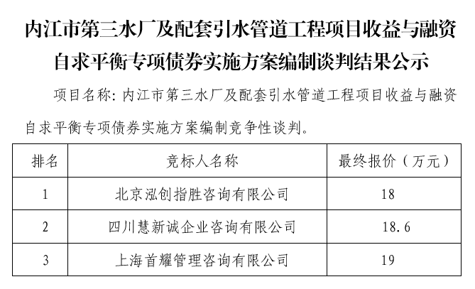內(nèi)江市第三水廠及配套引水管道工程項目收益與融資自求平衡專項債券實施方案編制談判結(jié)果公示