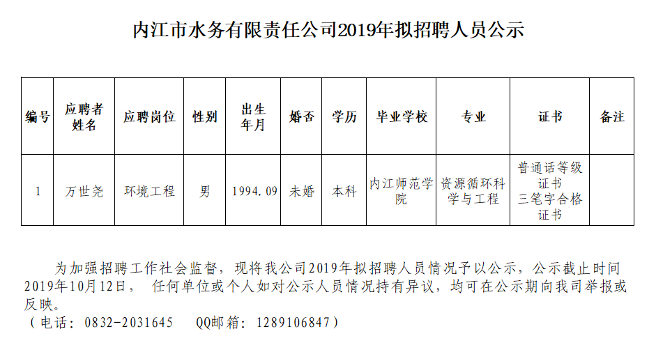 內(nèi)江市水務(wù)有限責(zé)任公司2019年擬招聘人員公示
