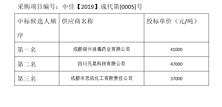 內江市污水處理有限責任公司碳源補充劑和輔助消毒劑招標項目(第2包)評標結果公示