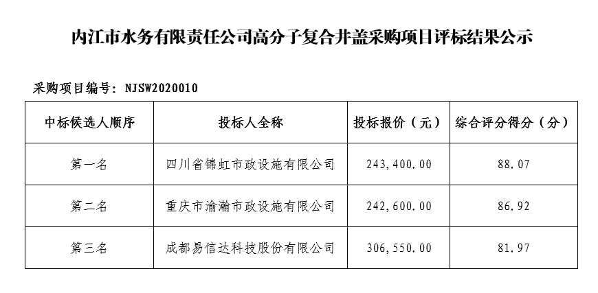 內(nèi)江市水務(wù)有限責(zé)任公司高分子復(fù)合井蓋采購項目評標(biāo)結(jié)果公示