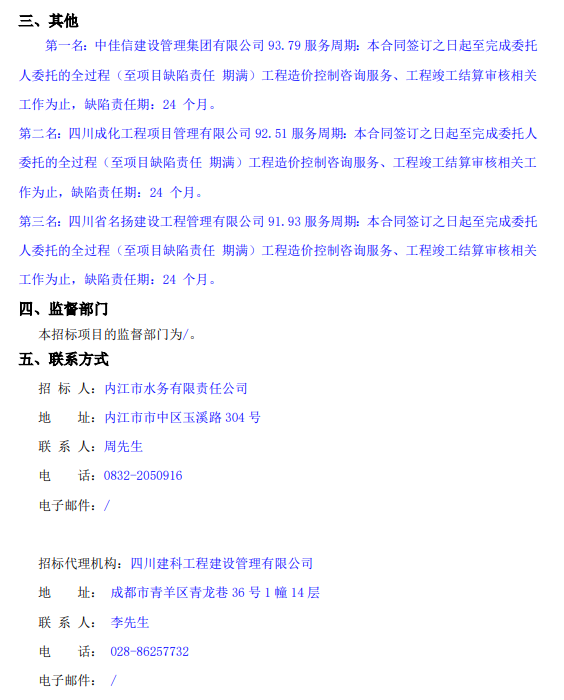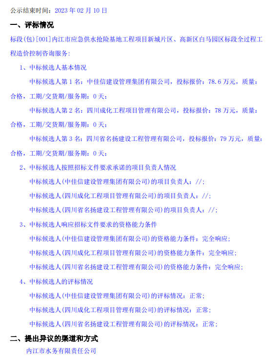 內(nèi)江市應(yīng)急供水搶險基地工程項目新城片區(qū)、高新區(qū)白馬園區(qū)標(biāo)段全過程工程造價控制咨詢服務(wù)中標(biāo)候選人公示