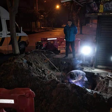2月2日晚8點40分,接到市民報漏電話,位于晏家灣車站外的供水主管爆裂,部門立即組織人員趕往現(xiàn)場。經(jīng)查看確認為一根DN150供水主管破裂,為了保障居民的正常用水,搶修人員連夜冒雨對供水管道進行搶修,經(jīng)過5個小時的搶險作業(yè),于次日凌晨1點完成搶修任務,保障了該區(qū)域居民正常用水。