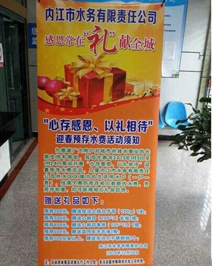 為感謝廣大用戶對(duì)城市供排水事業(yè)的長期支持和幫助,我司在2015年1月5日至1月24日期間開展“心存感恩、以禮相待”迎春預(yù)存水費(fèi)活動(dòng)。本次活動(dòng)由客戶服務(wù)部牽頭,在白馬辦事處、物資供應(yīng)部和機(jī)關(guān)各部門的支持配合下,圓滿結(jié)束。
