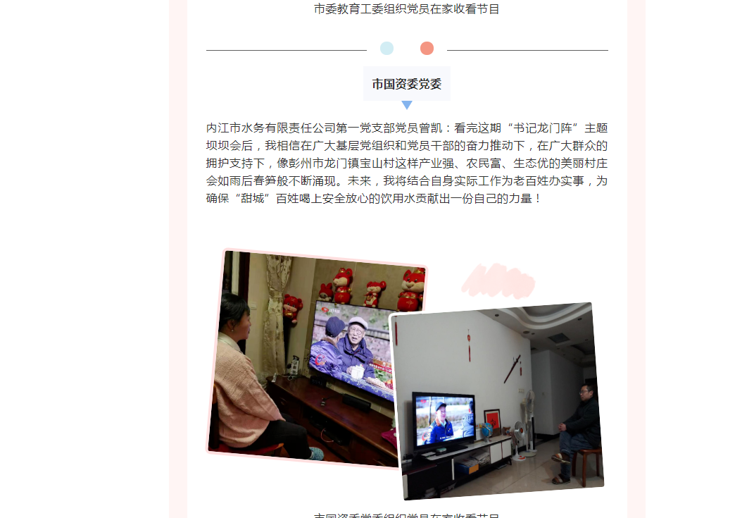 六個(gè)黨支部高度重視、立即行動(dòng),在周六晚上7:50準(zhǔn)時(shí)組織黨員收看節(jié)目,并在內(nèi)江水務(wù)黨務(wù)微信群里把收看照片和觀后感進(jìn)行分享,大家積極踴躍,學(xué)習(xí)氣氛熱烈。