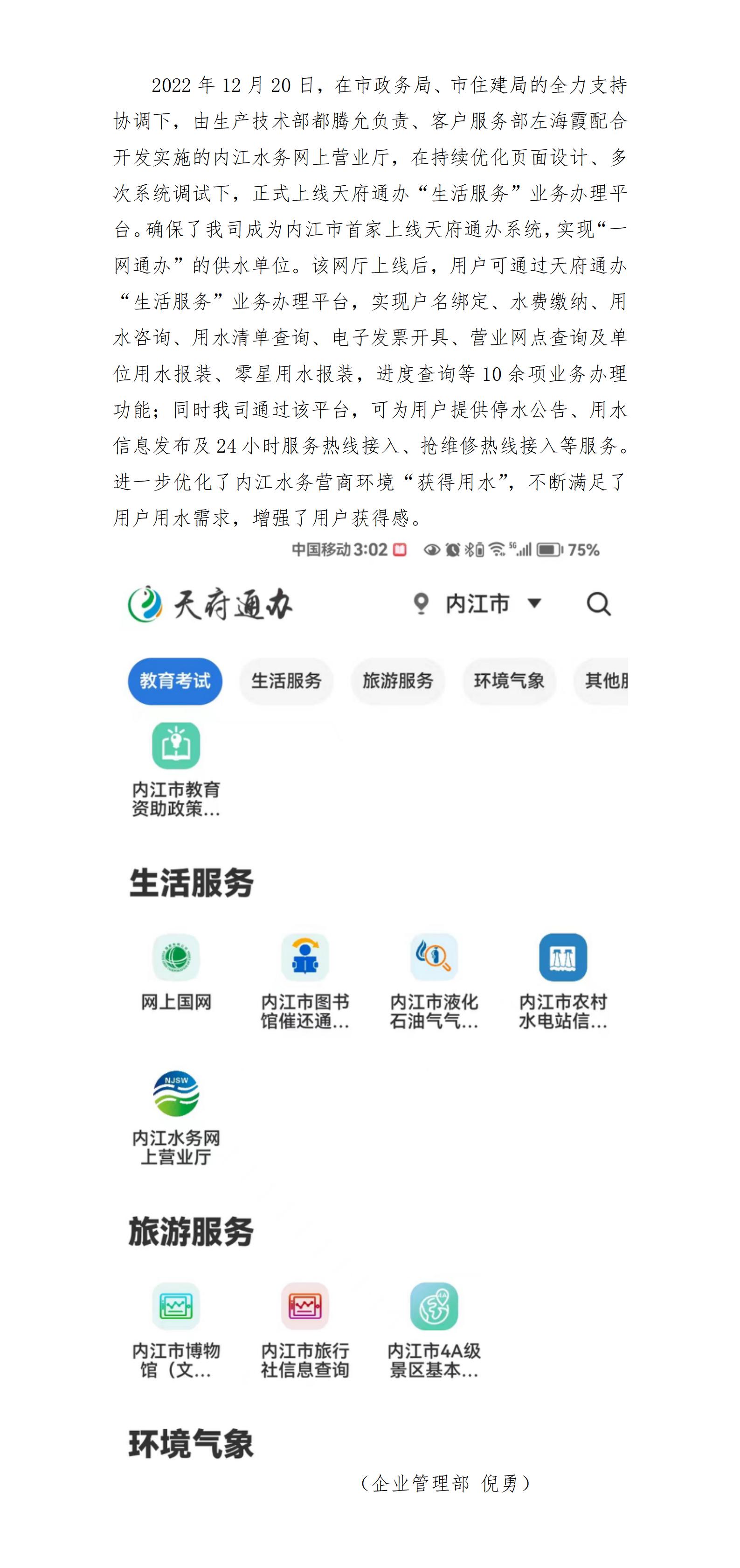 “讓數(shù)據(jù)多跑路,用戶少跑路” 內(nèi)江水務(wù)網(wǎng)上營業(yè)廳正式上線天府通辦平臺(tái)