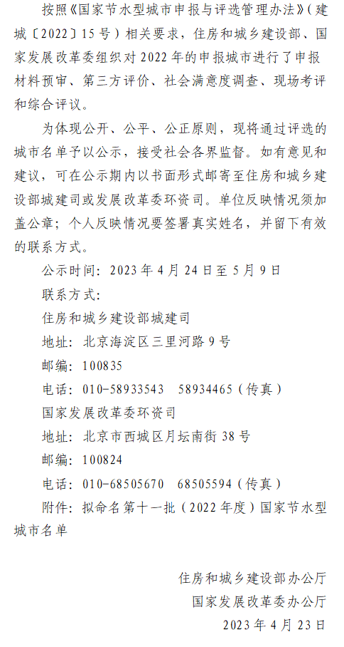 關于擬命名第十一批(2022年度) 國家節(jié)水型城市的公示