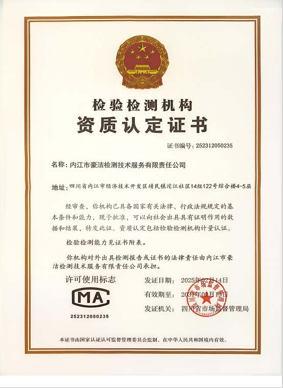 經(jīng)四川省市場監(jiān)督管理局批準(zhǔn),內(nèi)江市豪潔檢測技術(shù)服務(wù)有限責(zé)任公司正式取得《檢驗檢測機構(gòu)資質(zhì)認定證書》,此項資質(zhì)的取得標(biāo)志著我司在檢驗檢測方面已達到了國家相關(guān)標(biāo)準(zhǔn)和要求,具備了向社會提供公正、準(zhǔn)確的檢測服務(wù)資質(zhì)和能力。